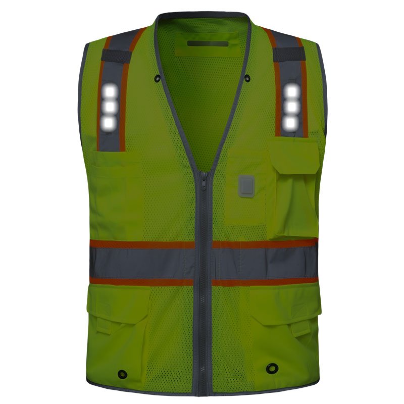 This high-visibility safety vest is made of 100% mesh polyester, offering superior breathability. It features three 2-inch wide reflective tapes that provide 360-degree protection, ensuring safety in low-light conditions. The Safety Vest is designed with four external and 3 internal pockets, including a tablet pocket, a standard pocket, and a battery pack pocket, providing convenient storage for various items. The front zipper closure allows for easy on and off. The LED lights operate in three modes: solid, strobe, and slow strobe, with white front LEDs and red rear LEDs. This hi vis vest is ideal for road construction, traffic management, warehouse logistics, emergency rescue, and outdoor activities.