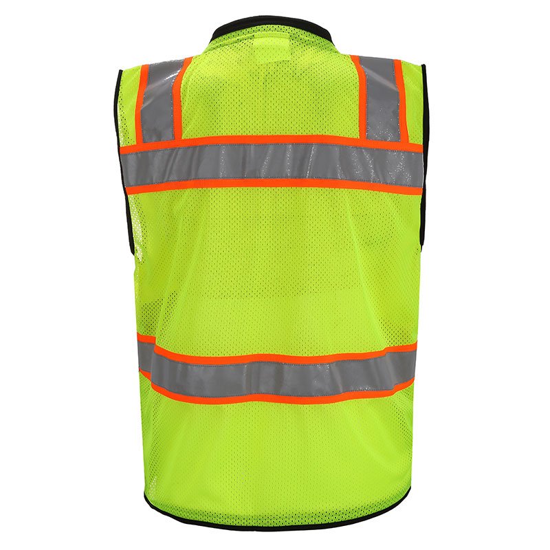 This high-visibility safety vest is made from breathable 100% polyester mesh, ensuring you stay cool during outdoor work. Featuring four 2-inch reflective tapes, it provides 360-degree visibility for excellent safety in both day and night conditions. The vest includes two flap chest pockets for storing notebooks, pens/pencils, and other accessories, as well as a heavy-duty front zipper closure with reinforced webbing for durability. Black and reflective trim adds a professional look and reinforced grommets and mic tabs on the chest offer additional functionality. Ideal for traffic control, construction sites, emergency rescue, event organization, and security work.