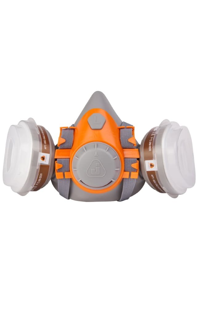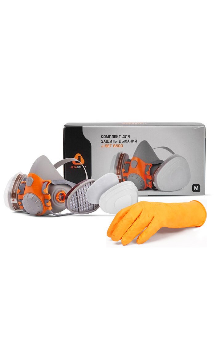 Respiratory protection kit J-SET 6500 JETA (J-Set Jeta) with a reusable protective half mask made of 100% soft silicone-containing rubber of gray-orange color, which provides a high level of comfort and reliable protection against vapors of paints, varnishes and enamels, adhesives, solvents, sealants, tar, dust. It has a bayonet mounting system that allows you to install filters with an easy half-turn movement. The half mask is used with JETA SAFETY filters: A1, AE1, ABEK1, P3.